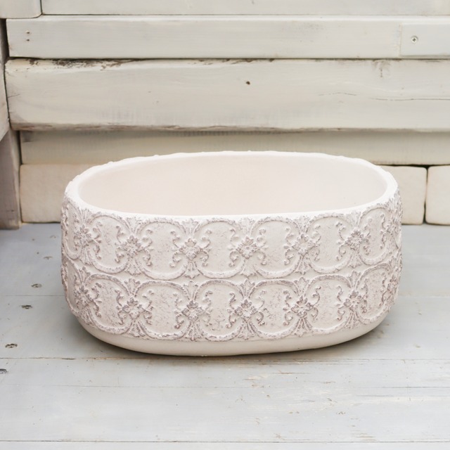 【クロヌポット オーバルについて】 繊細なレリーフ模様が美しい、 横長タイプのオーバルポット。 クラシカルな雰囲気と 重厚感のある佇まいで、 寄せ植えを格上げしてくれる一鉢です。 大人カワイイ模様に、 思わずひとめぼれ。 甘すぎず、 上品にまとまるデザインは どんなお花とも相性が良く、 幅広くお使いいただけます。 村田屋産業さんの 2025年新作アイテムです。 <サイズ> ・外寸:幅27.5cm × 奥行17cm × 高さ20cm ・内寸:幅23cm × 奥行13cm × 高さ18.5cm ・底穴:あり ・素材:セメント <商品についてのご注意> ・仕上げた表面は、他には見られない独特の風合いがあります。 ・自然な風合いを出すため、1点1点同じ表情ではございません。 ・ハンドメイドのため、サイズ・色味に若干の個体差がございます。 ・若干の擦れ傷や、底穴周辺に焼ヒビが見られる場合がございます。 ・写真に写っている植物や小物は付属いたしません。鉢のみの販売です。 <おすすめの使い方> 横長の形を活かして、 複数株の寄せ植えに。 プリムラやビオラ、 ヒナソウなどを組み合わせると、 奥行きのある華やかな仕上がりになります。 リーフ多めのナチュラル寄せ植えも とてもよく似合います。 <Green heartからのひとこと> 甘さと重厚感のバランスが絶妙なデザイン。 空間にそっと品格を添えてくれる、 存在感のあるポットです。 長く愛用していただける一鉢です。