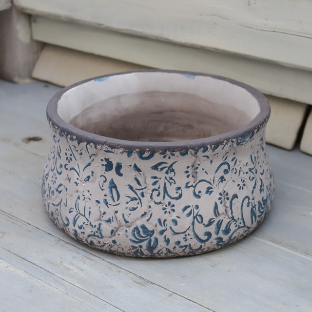 アンプリメフルールフラットL|アンティーク調ブルー模様の低鉢タイプ セメントポット