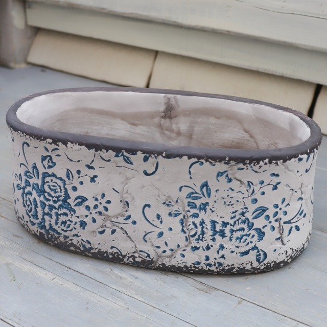 アンプリメフルールオーバルL|アンティーク調ブルー模様の横長セメントポット 大きめサイズ