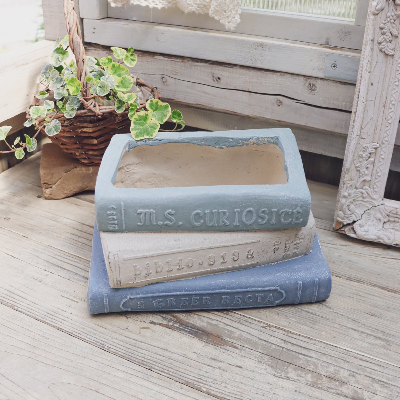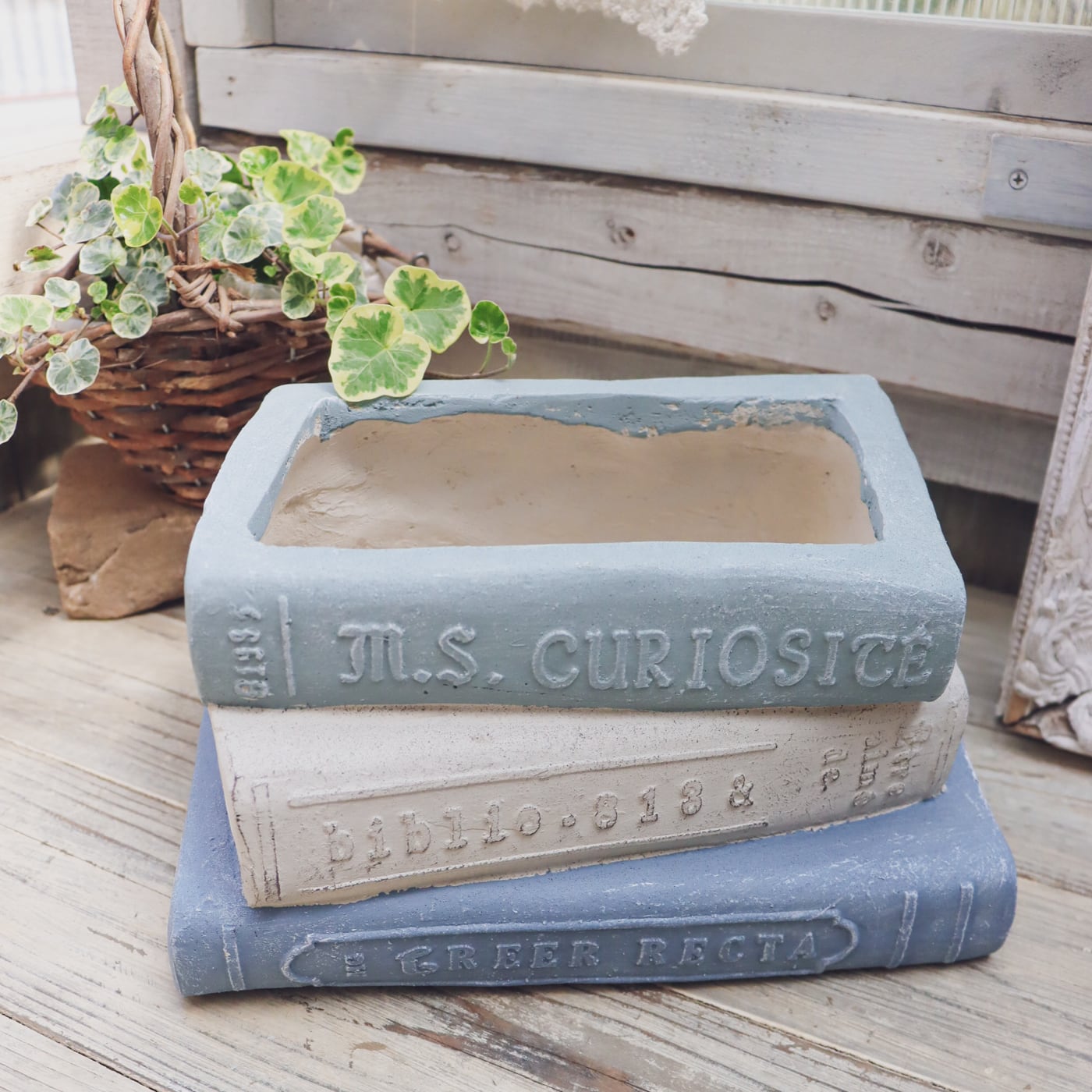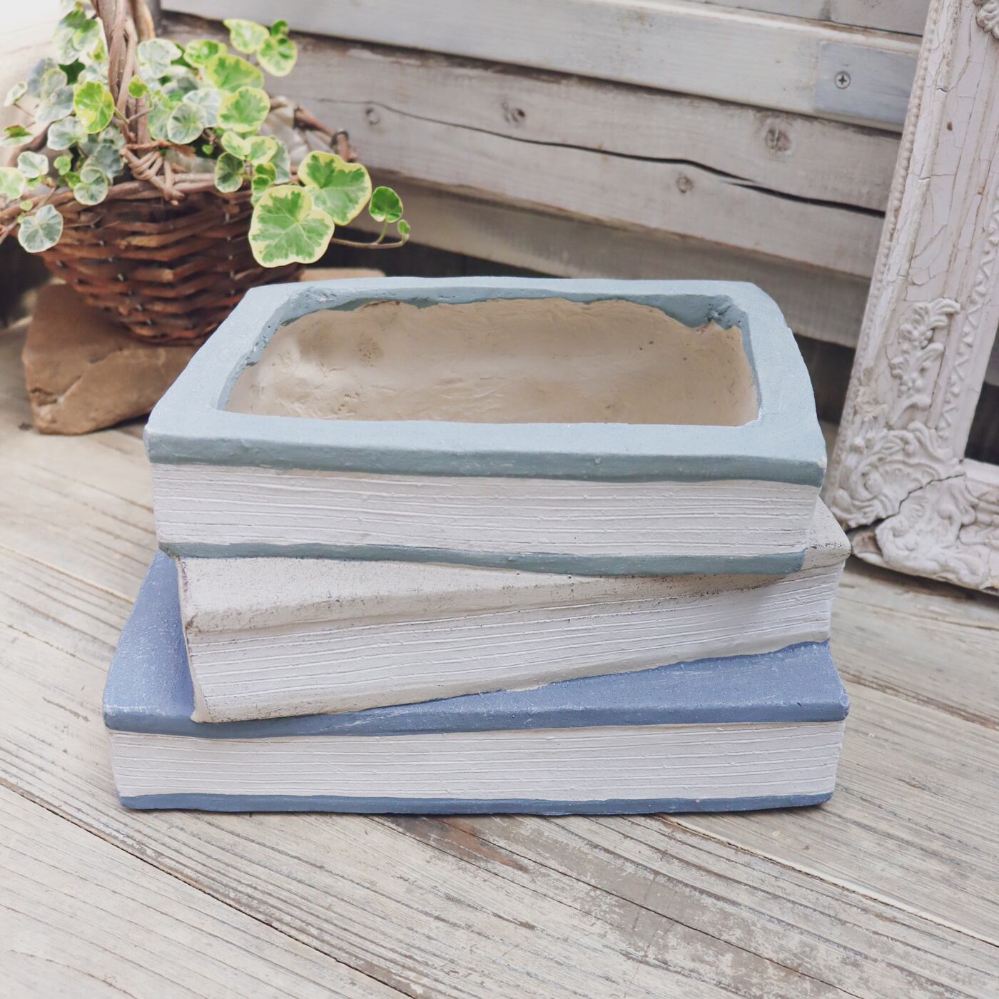 洋書モチーフのブック型プランターです。