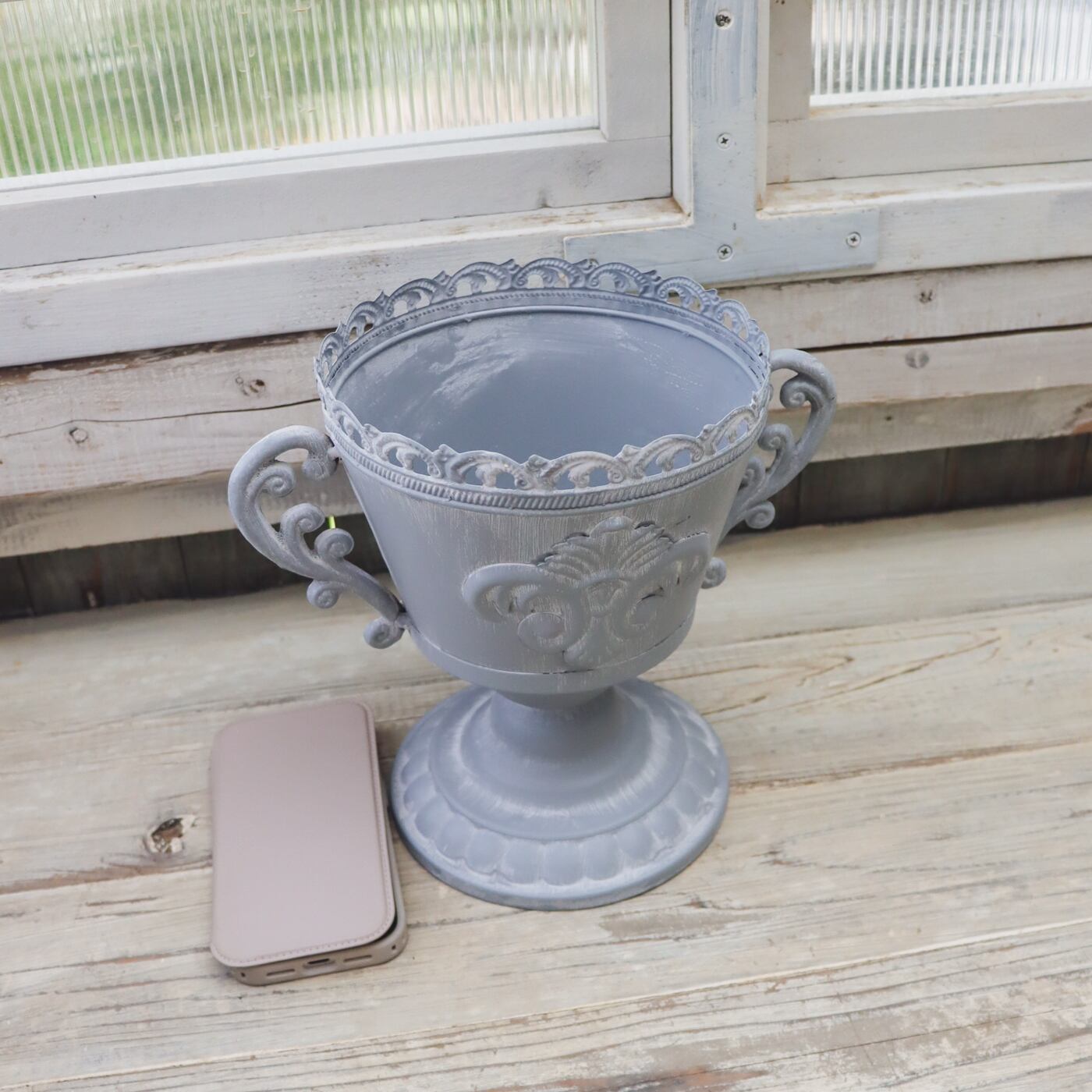 ゴブレット型のアンティーク調ブリキ鉢。