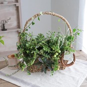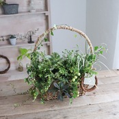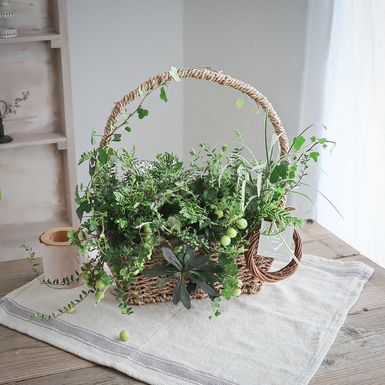 かごは軽くて風合いの良いハンギングタイプの天然素材バスケットを使用しました。