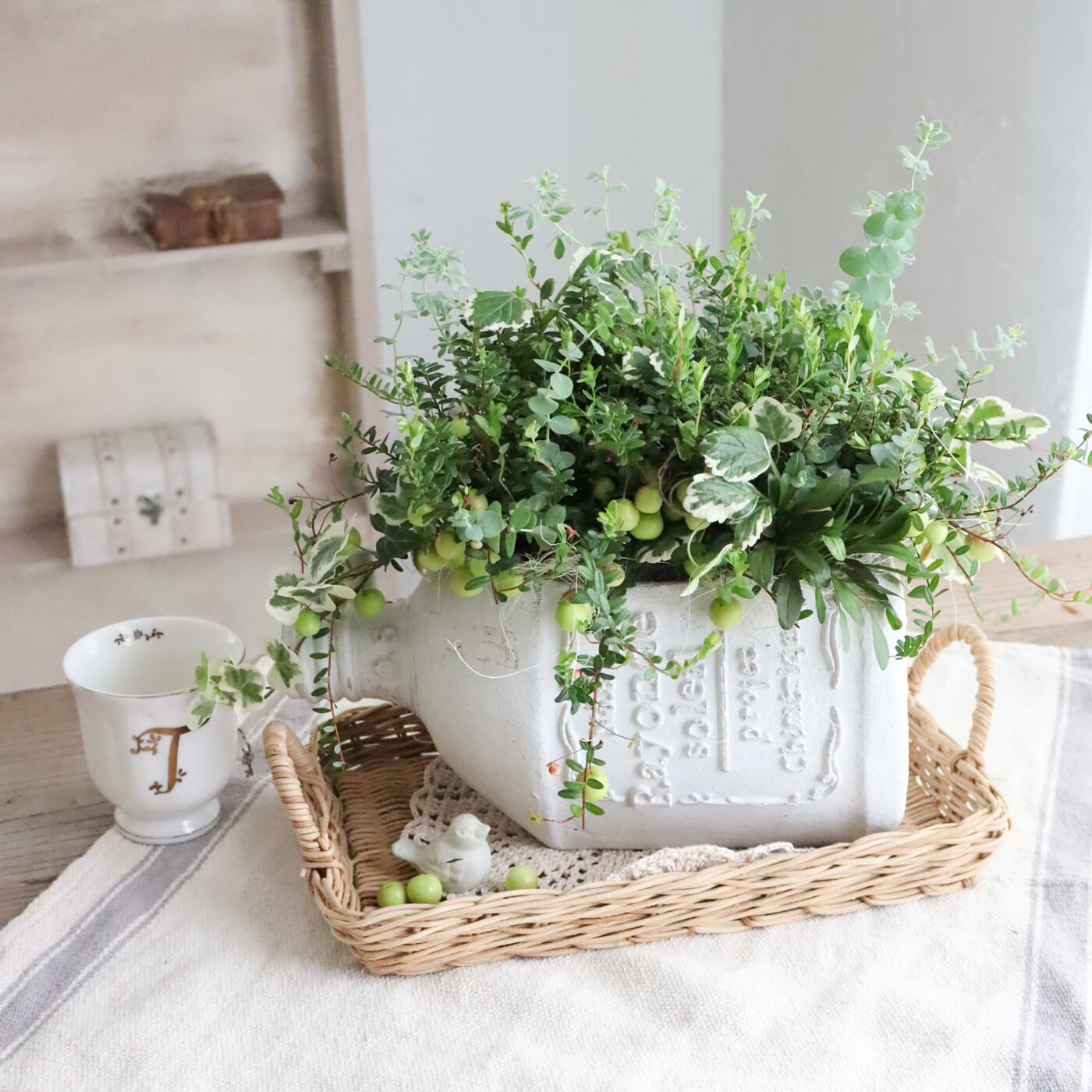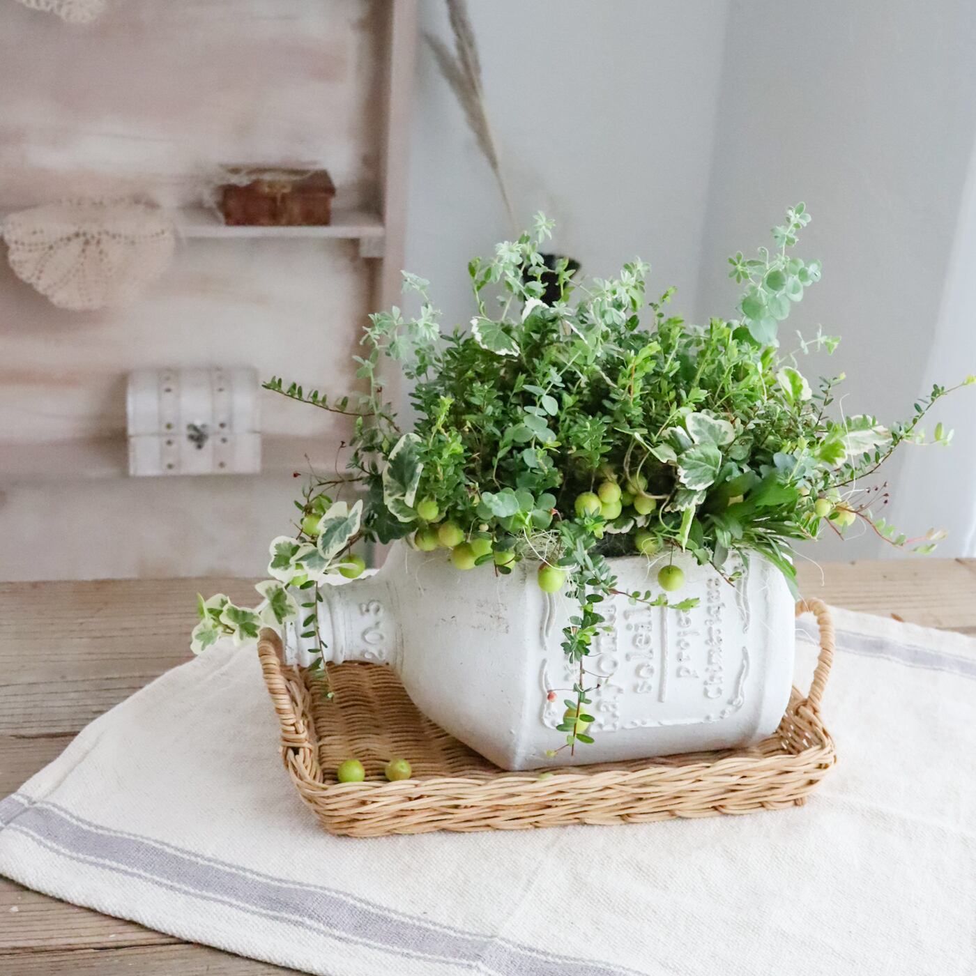 ボトルからグリーンがシャワーのように弾ける、遊び心たっぷりの寄せ植え作品です。