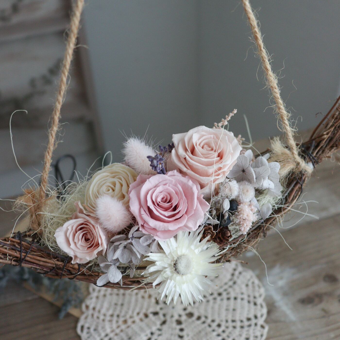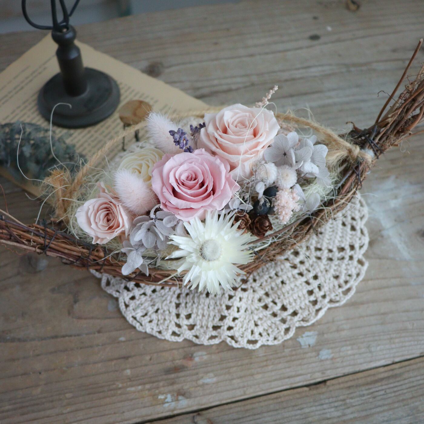 柔らかなピンクローズを中心に、ホワイトやラベンダー色の花材を合わせ、