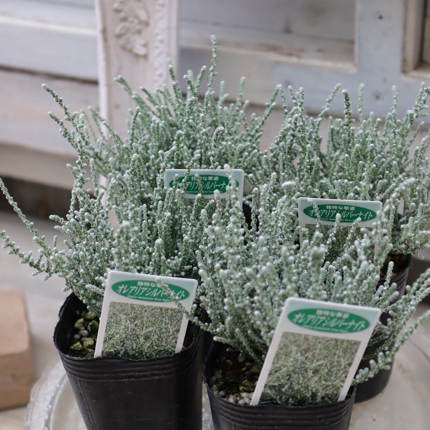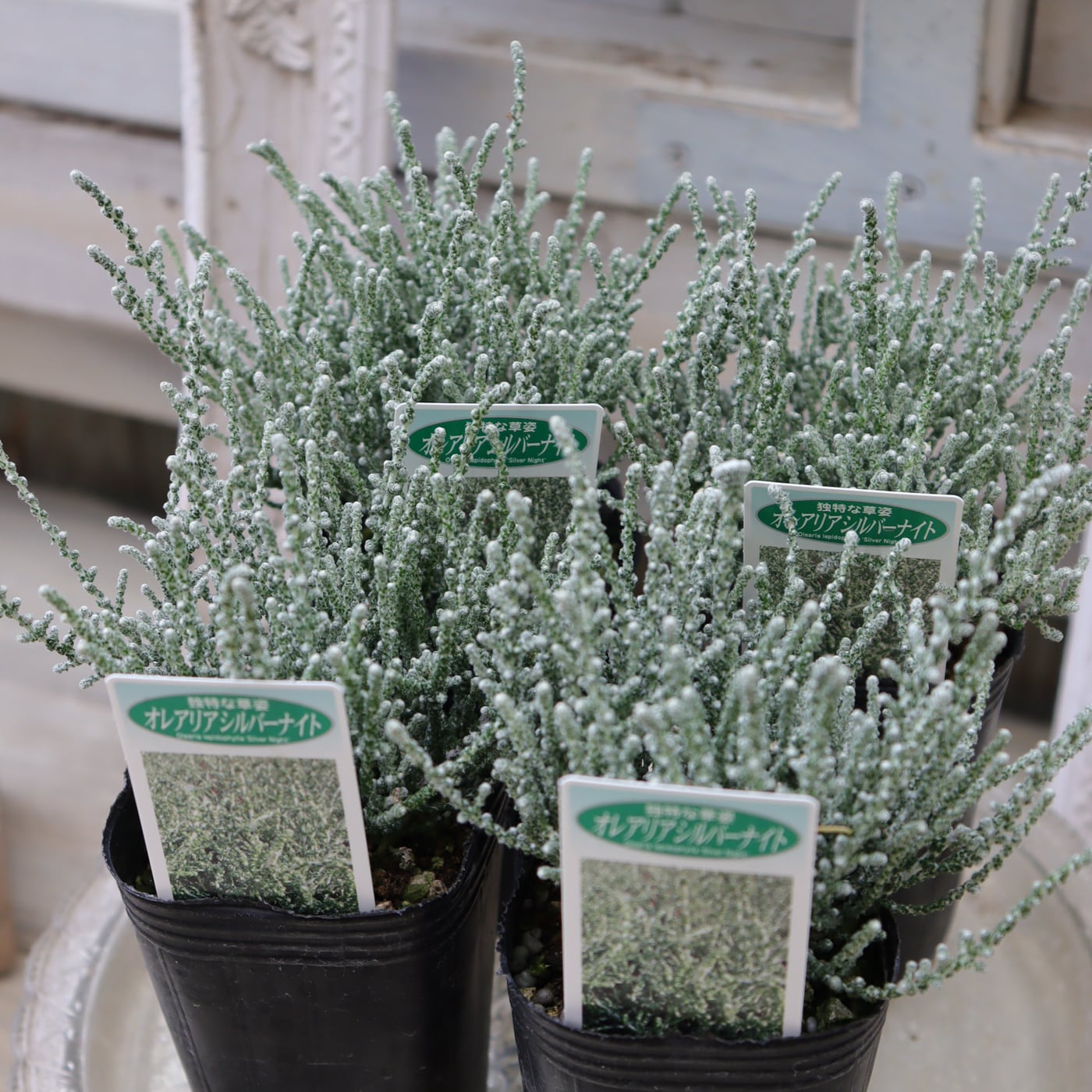 オレアリア・シルバーナイトは、銀白色の細やかな葉が美しい常緑低木です。