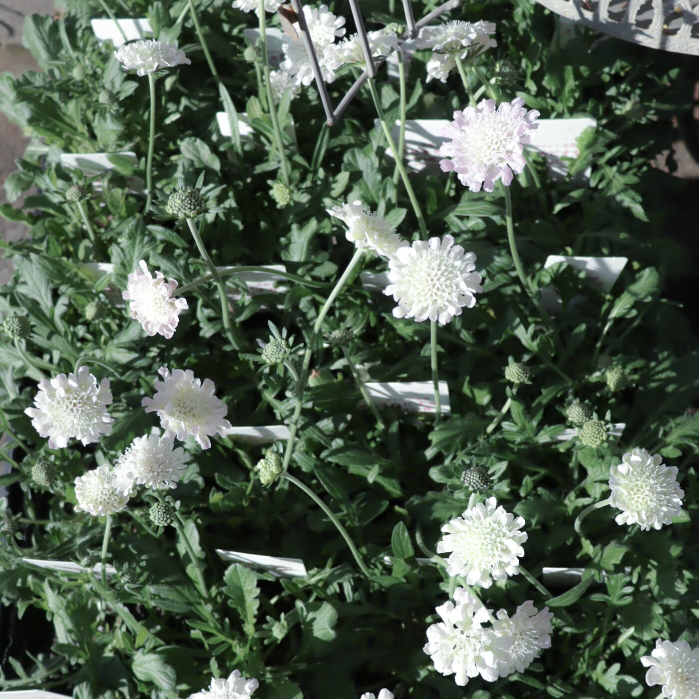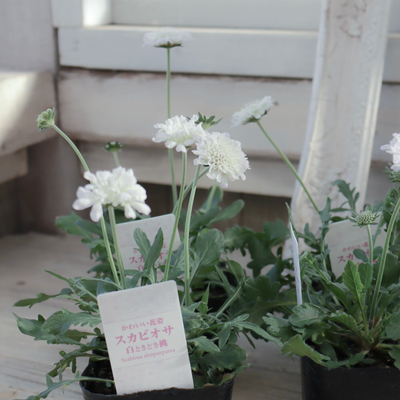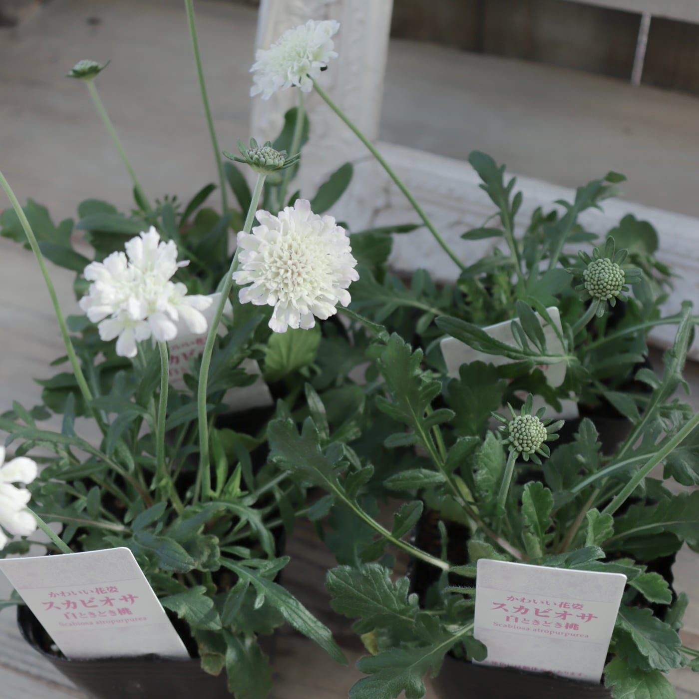 やさしい表情のスカビオサ「白ときどき桃」です。