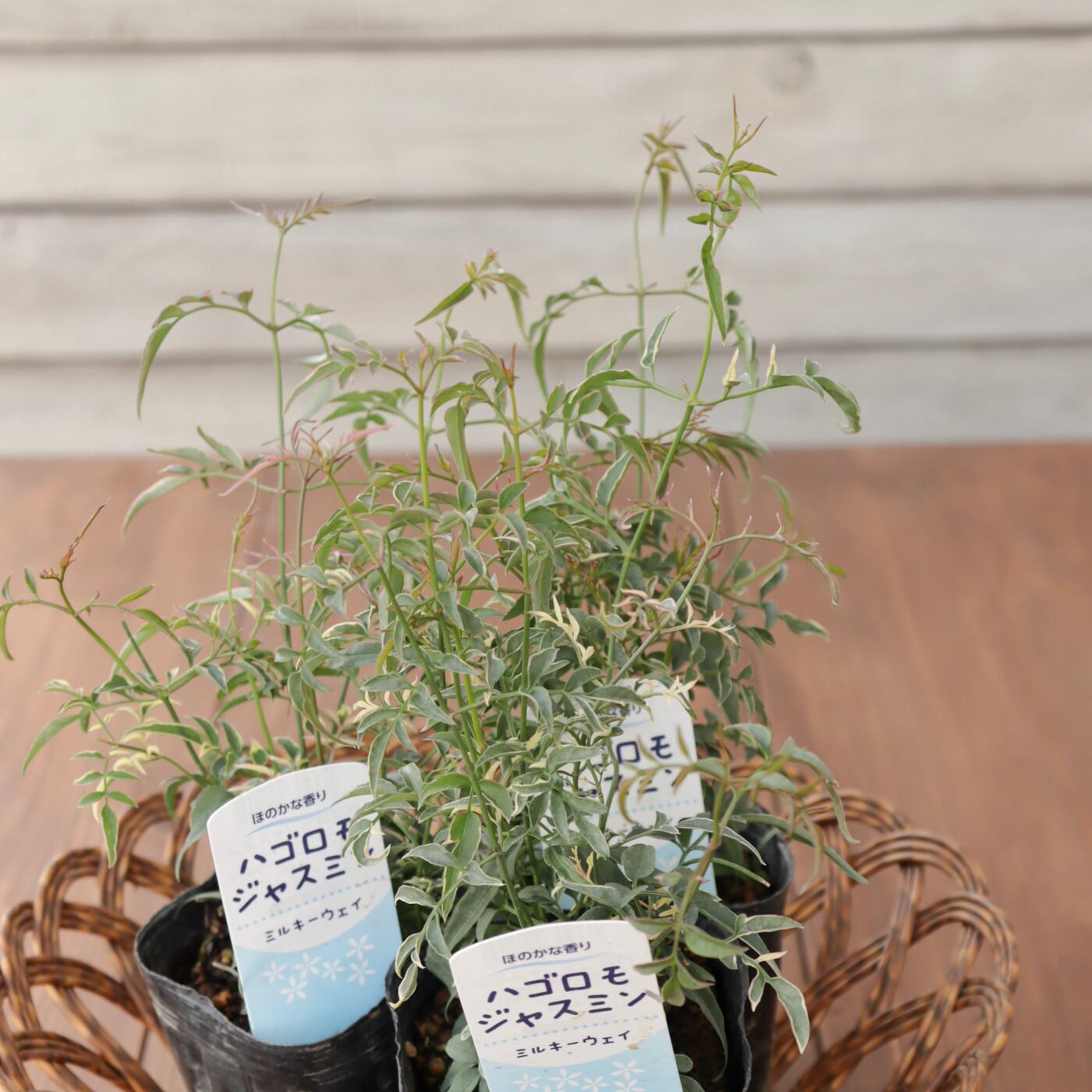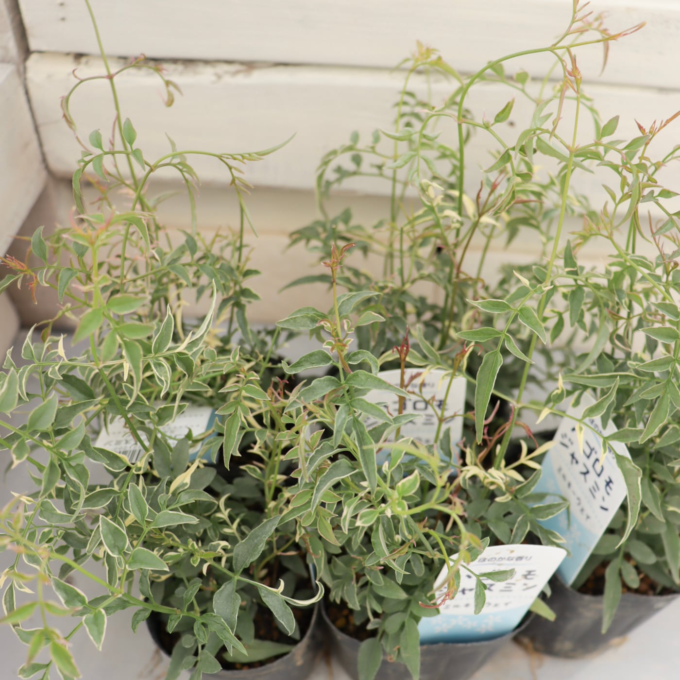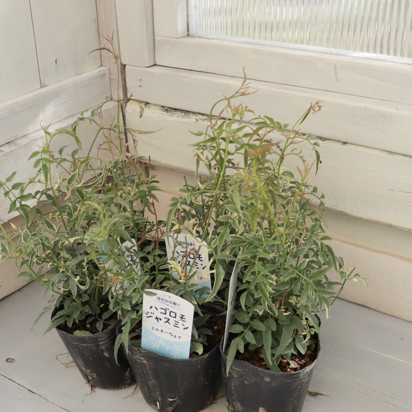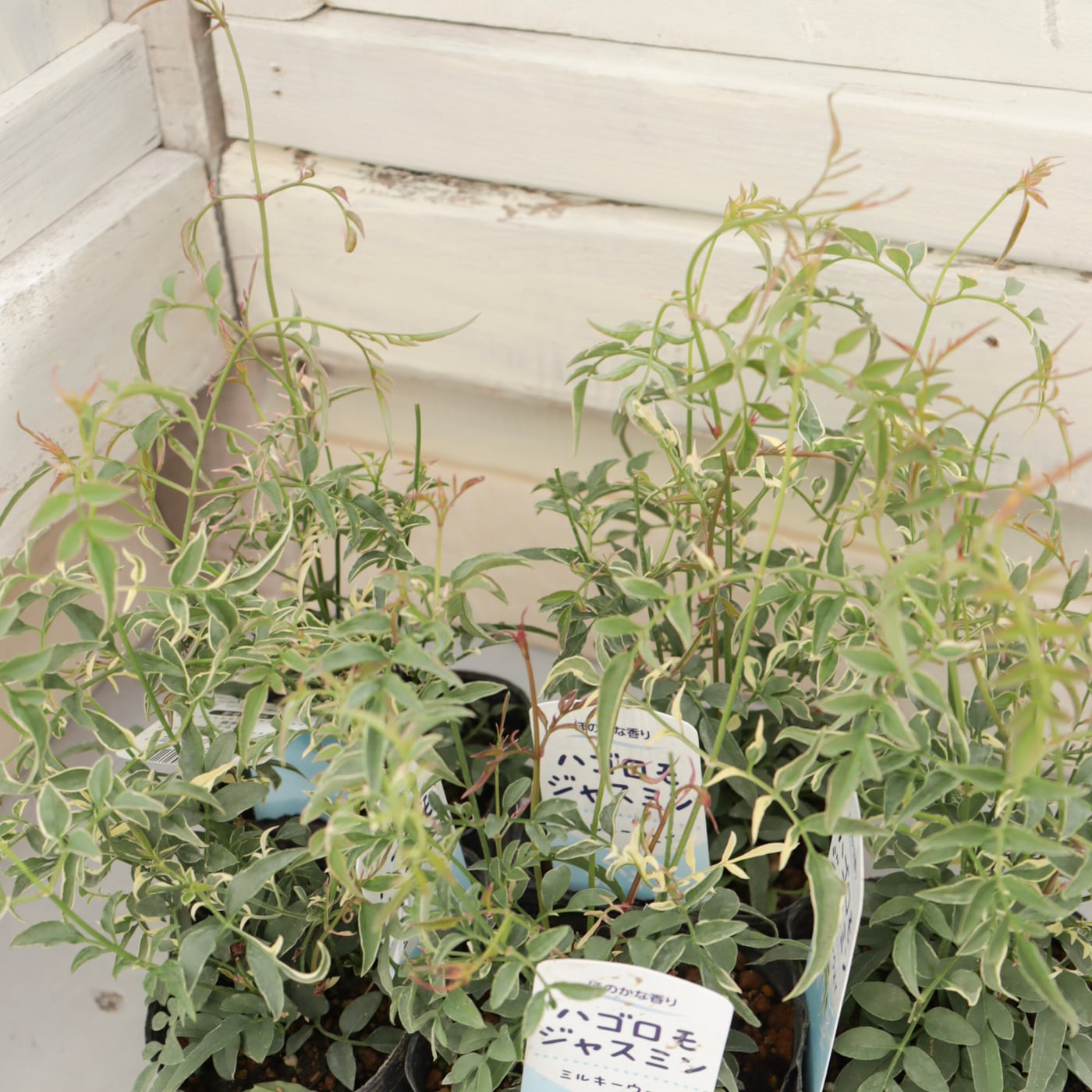 白い斑が入った細やかな葉がとても可愛らしい、ハゴロモジャスミンの人気品種 “ミルキーウェイ” です。