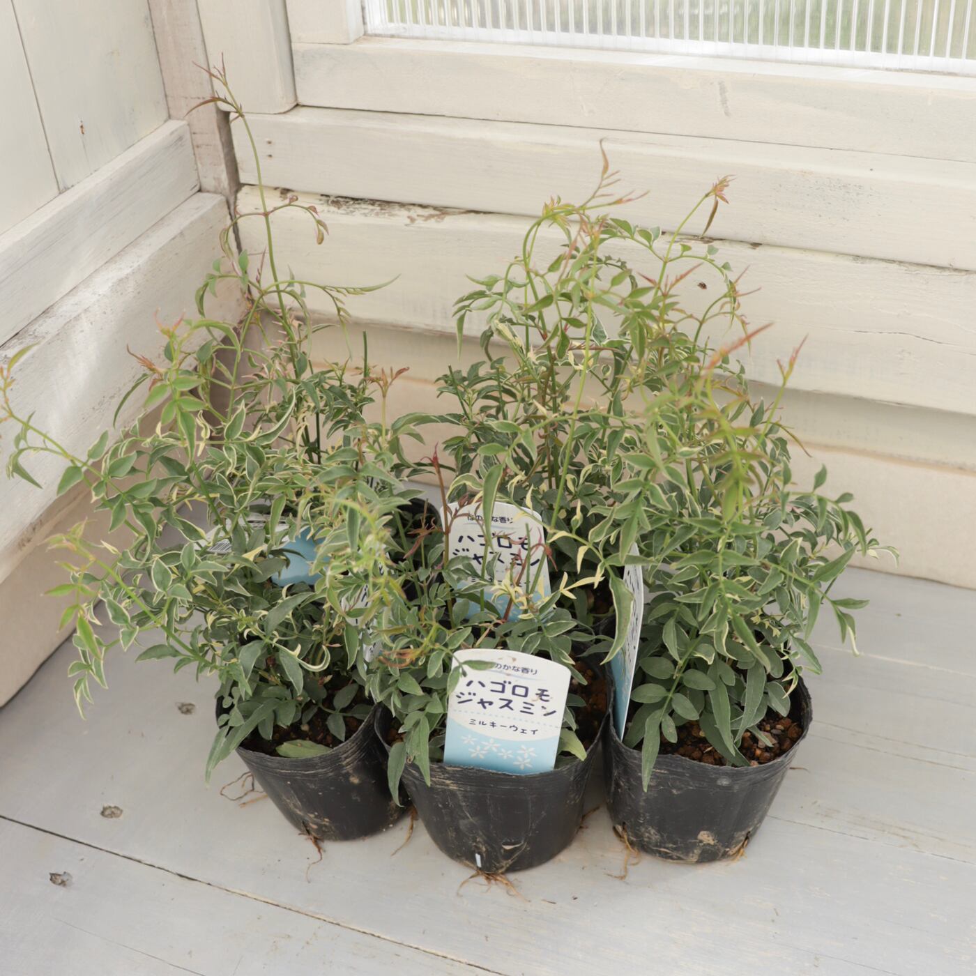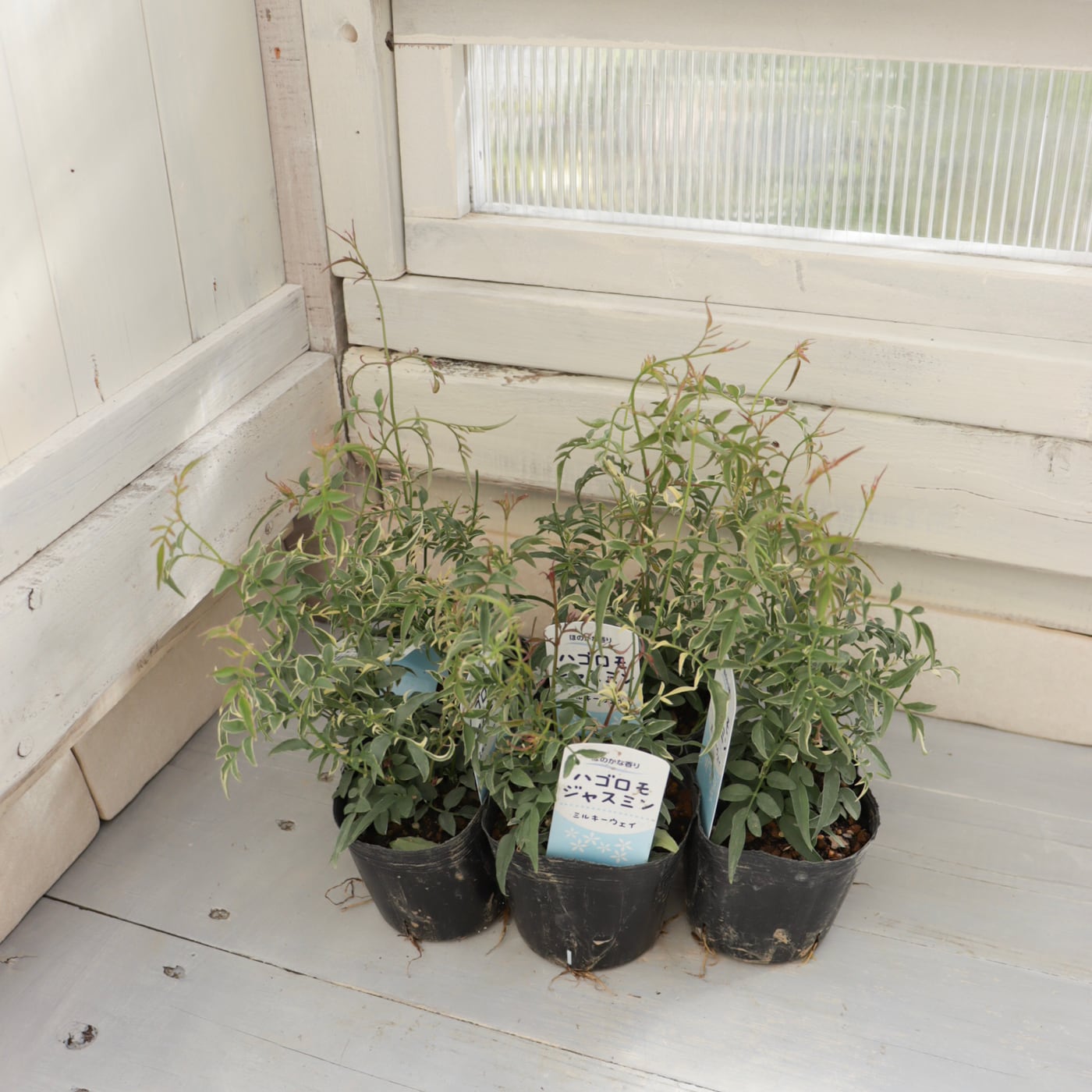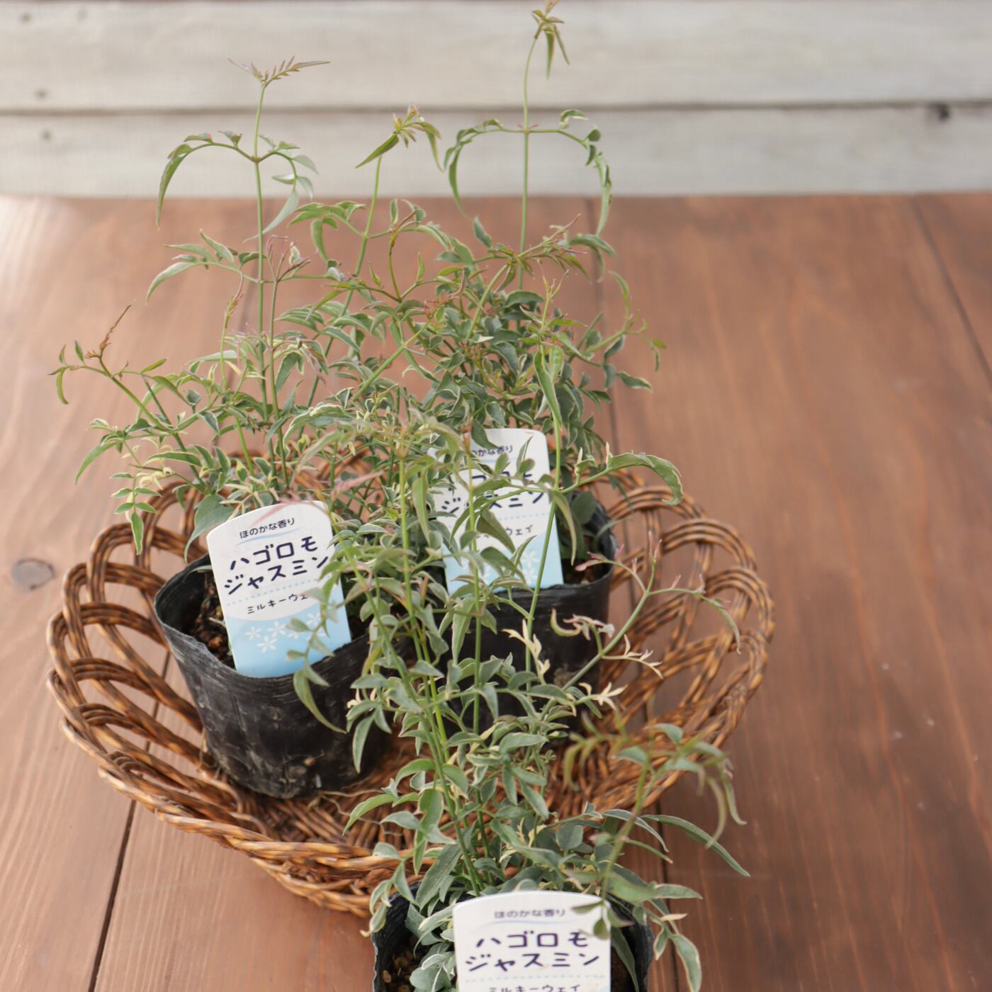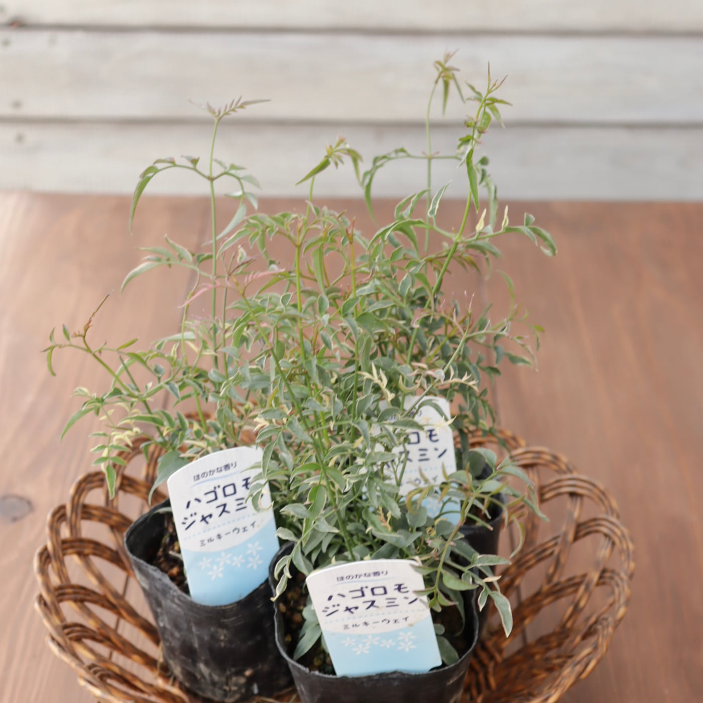 白い斑が入った細やかな葉がとても可愛らしい、ハゴロモジャスミンの人気品種 “ミルキーウェイ” です。