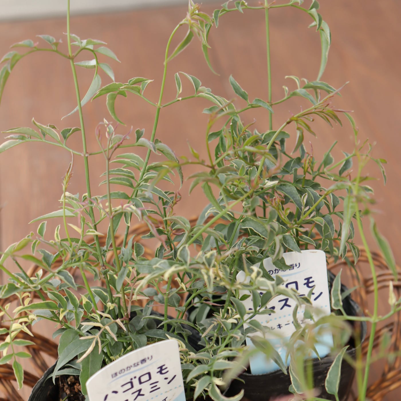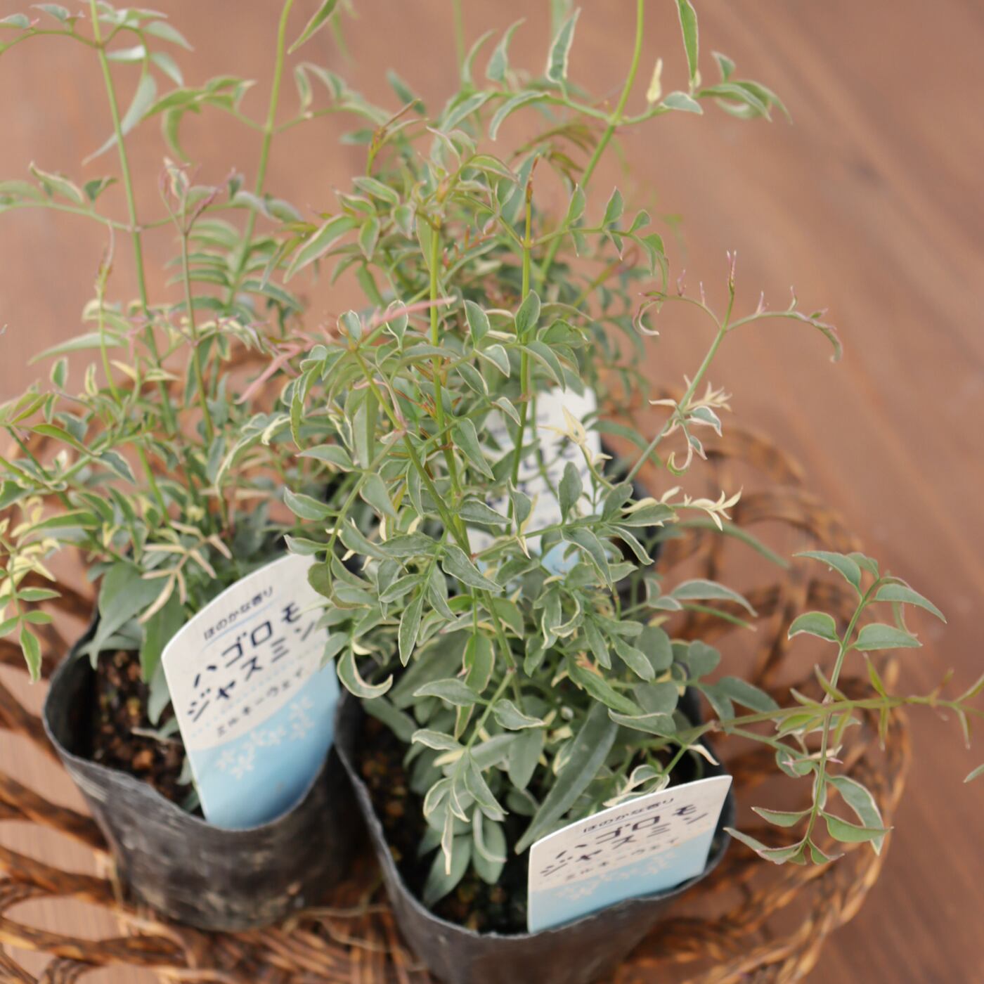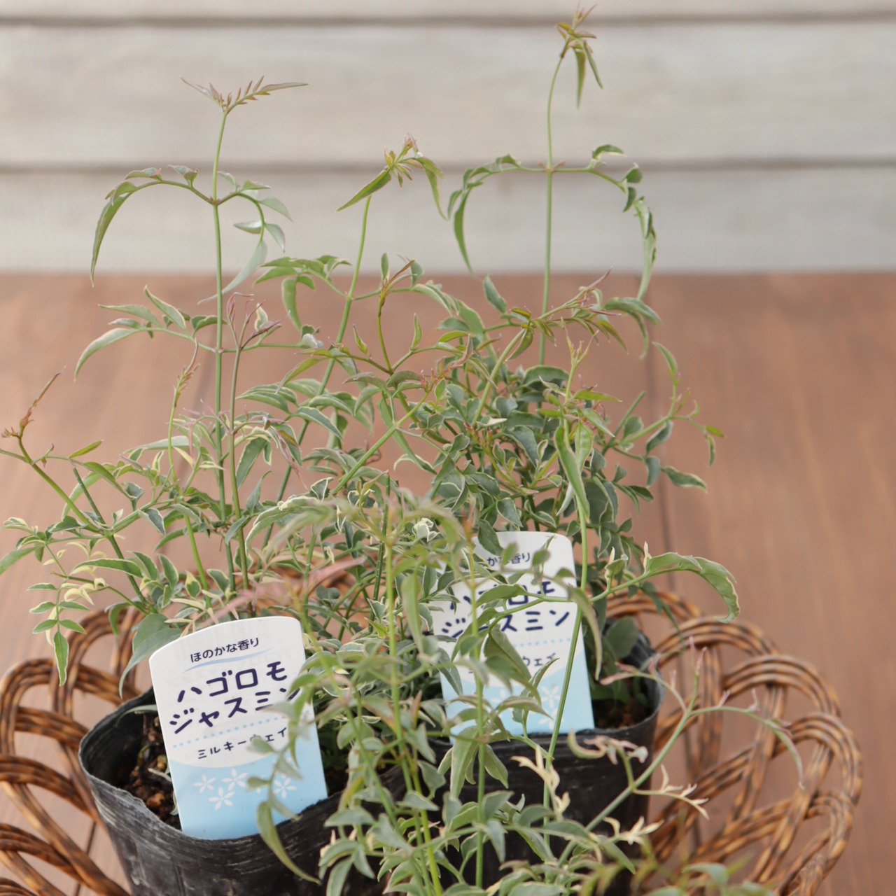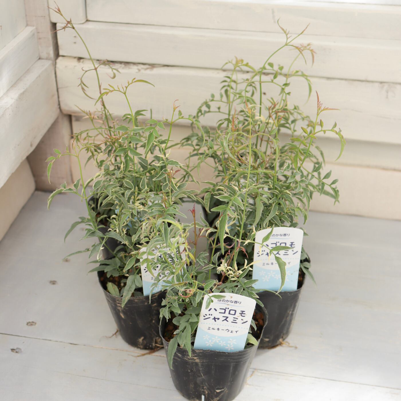 白い斑が入った細やかな葉がとても可愛らしい、ハゴロモジャスミンの人気品種 “ミルキーウェイ” です。