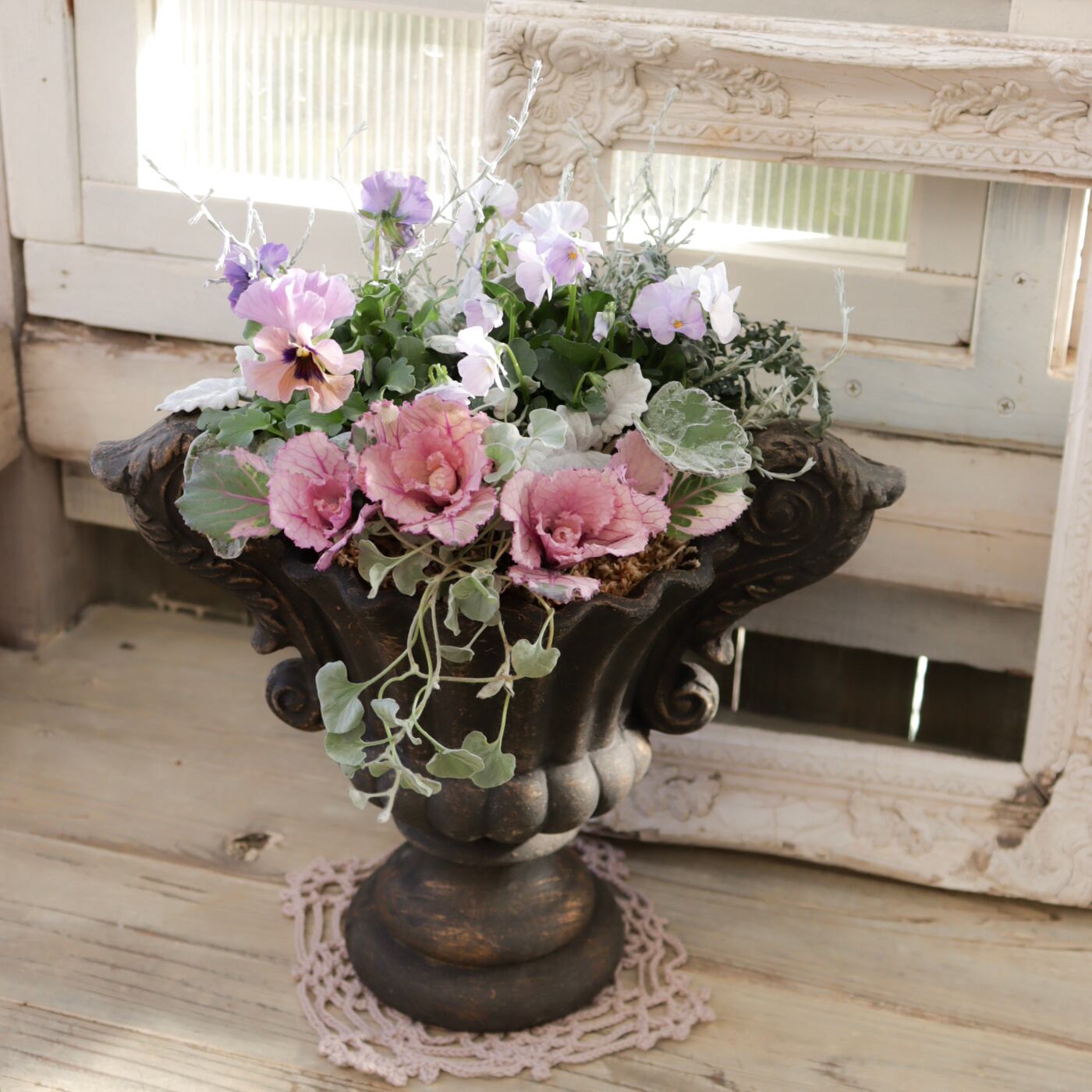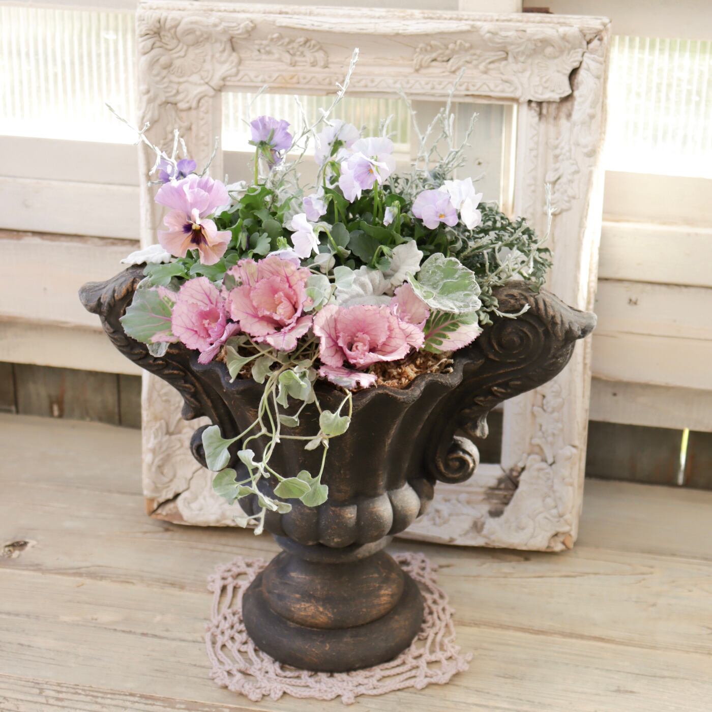 足元にはアンティーク調のゴブレット鉢を使用し、