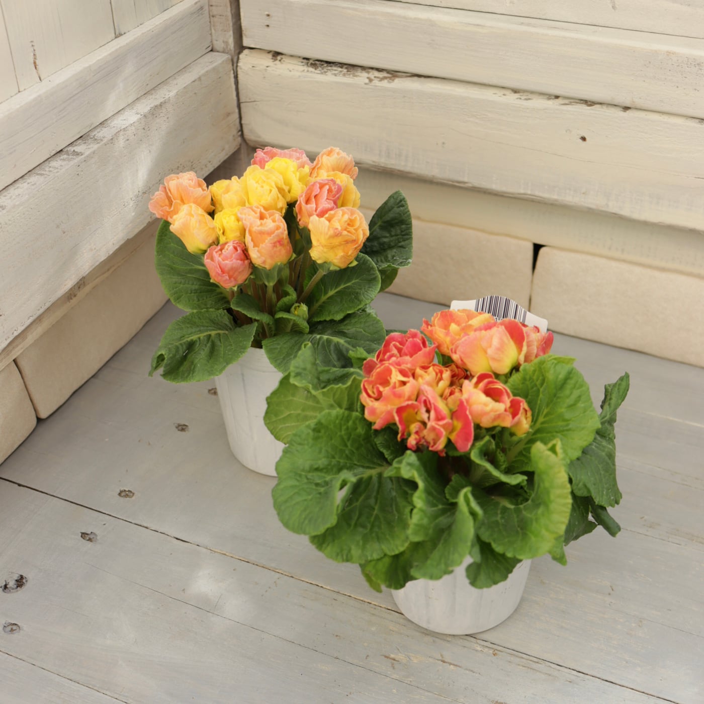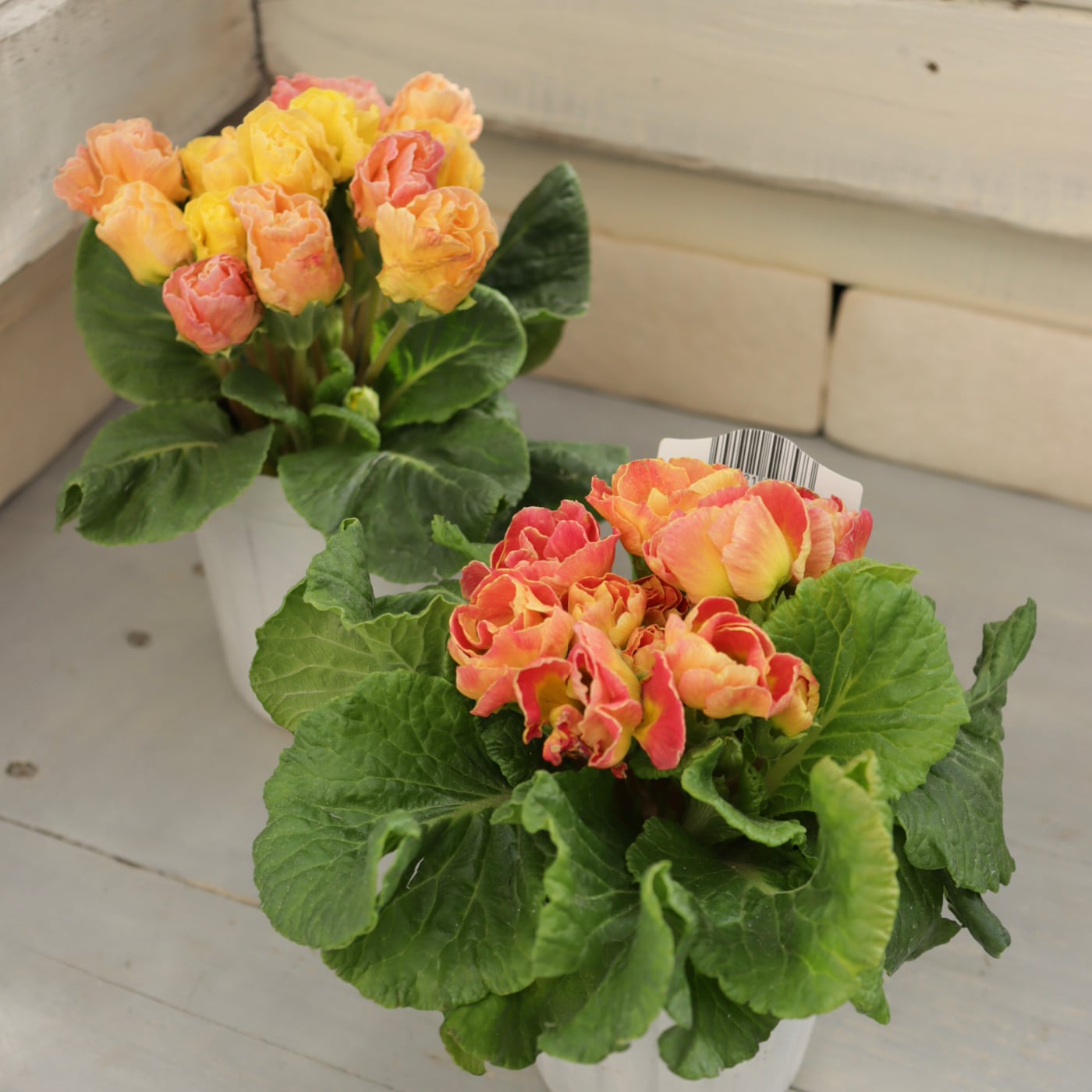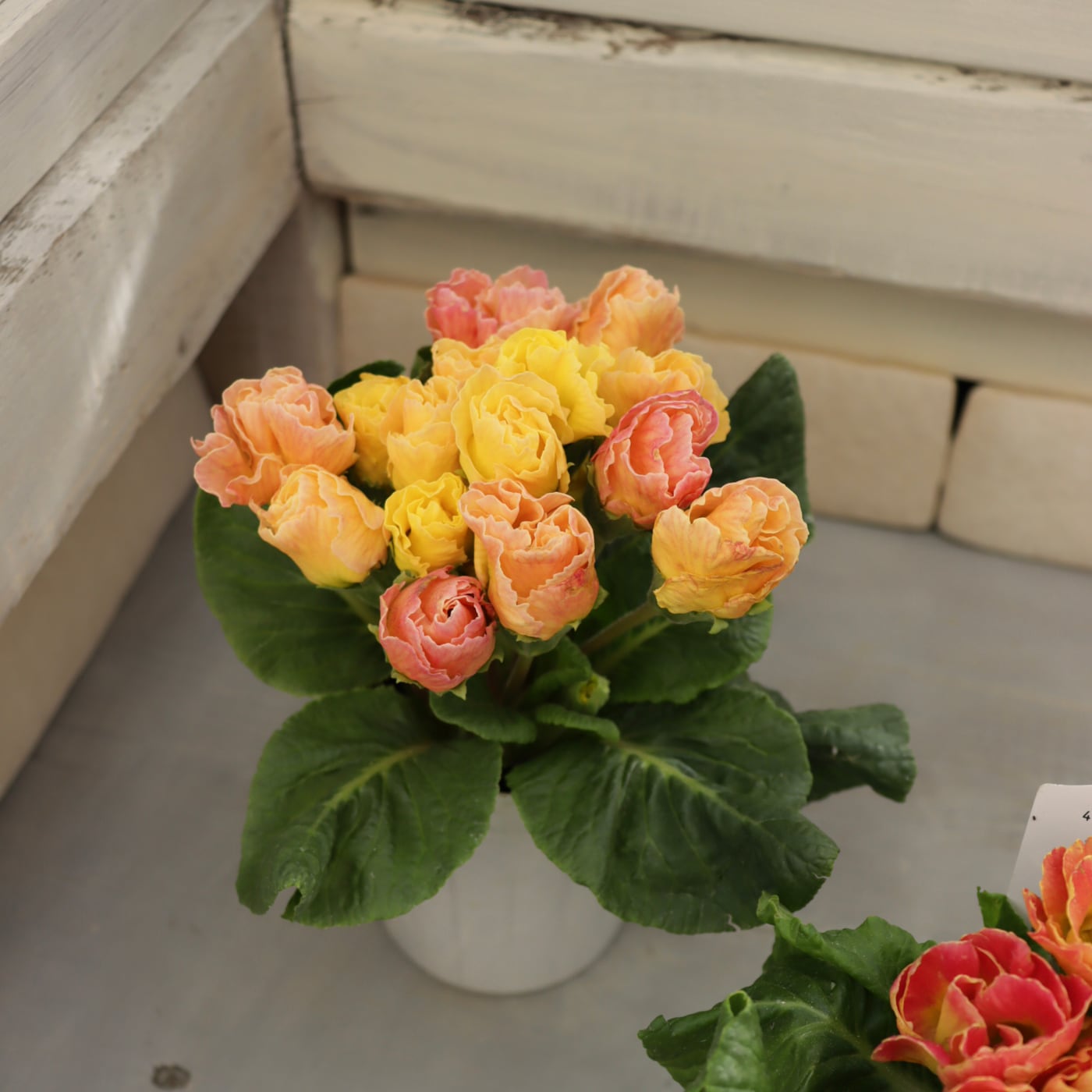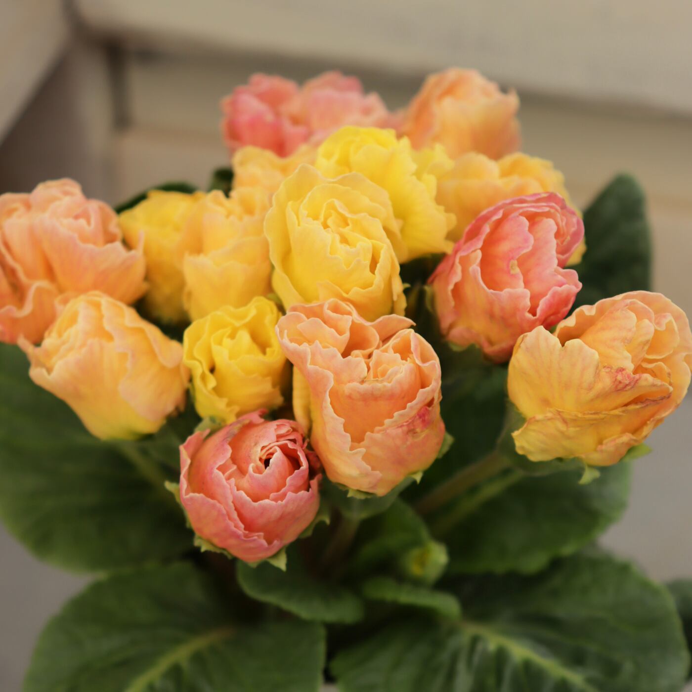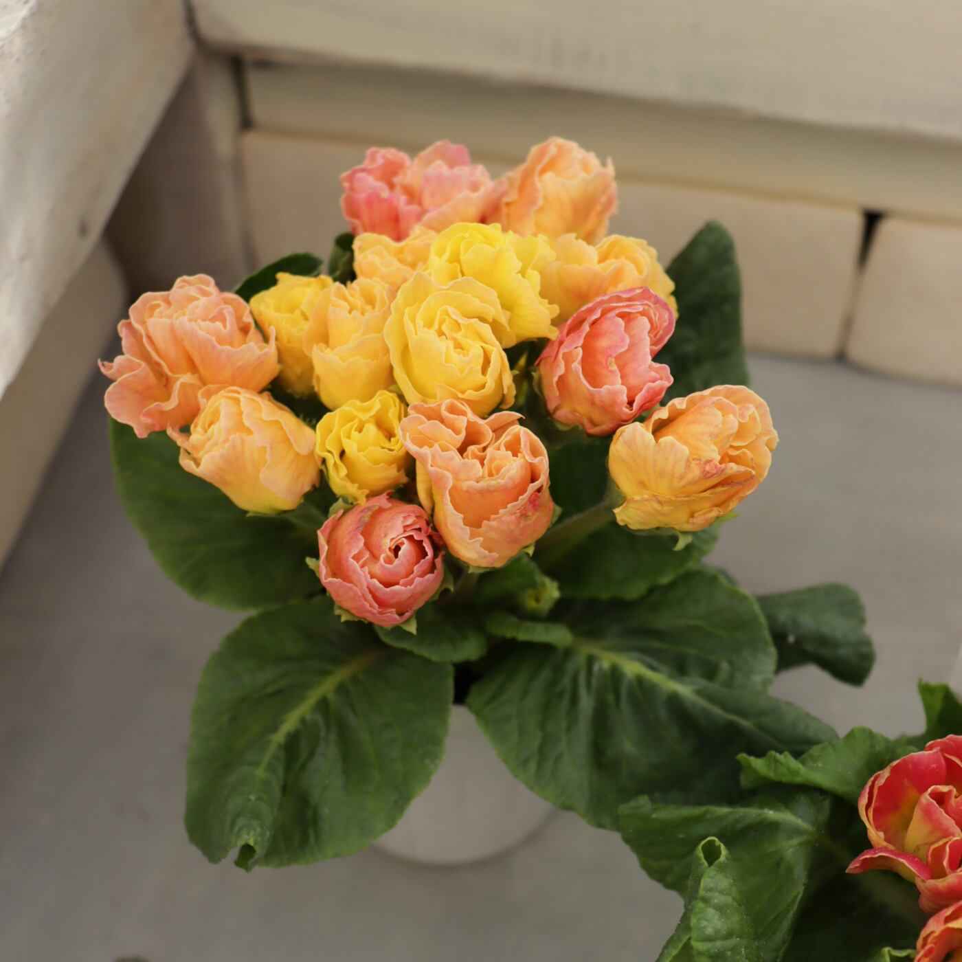 プリムラ・ジュリアン ‘マビリア’春灯り|やわらかな杏色と黄のグラデーションが美しい ローズ咲き