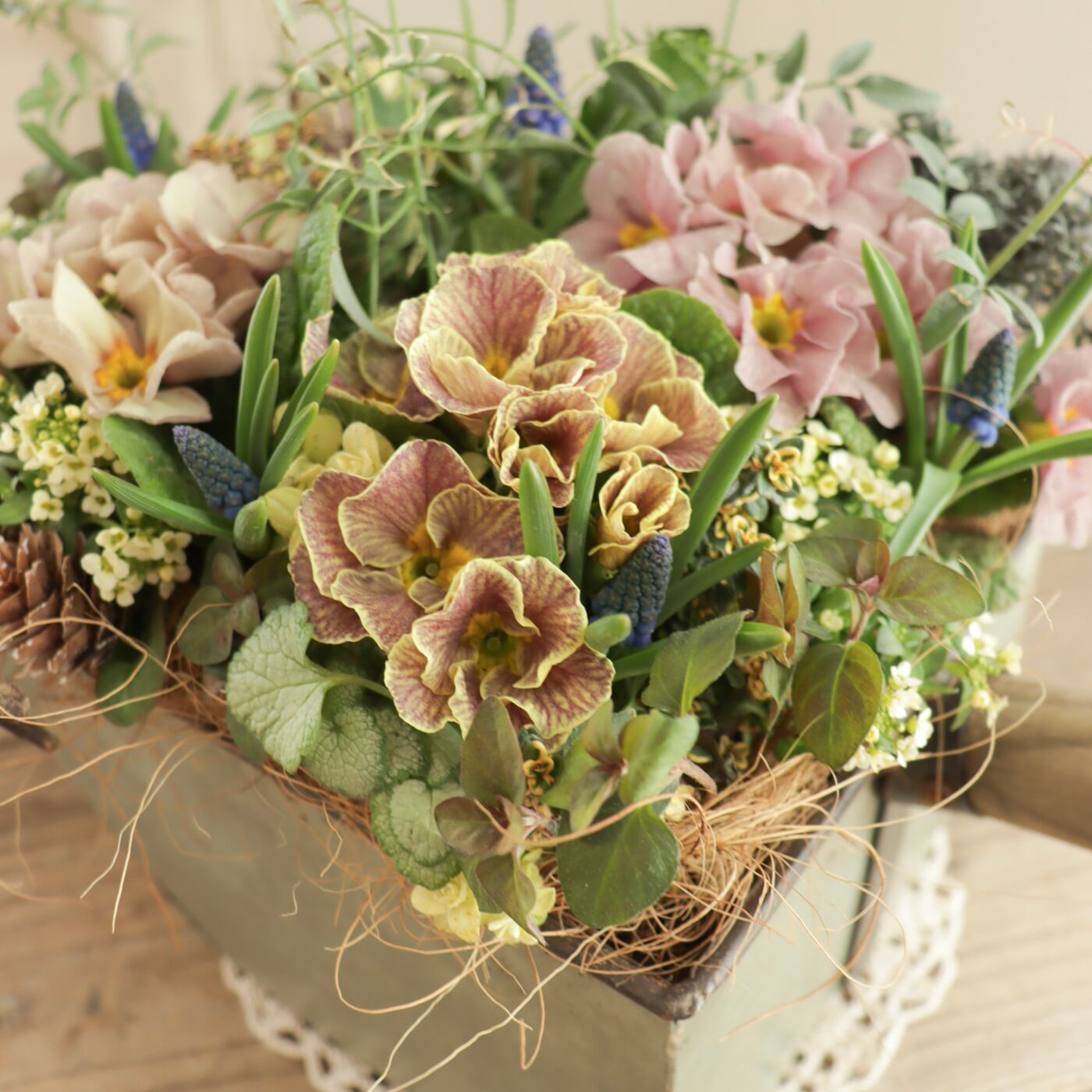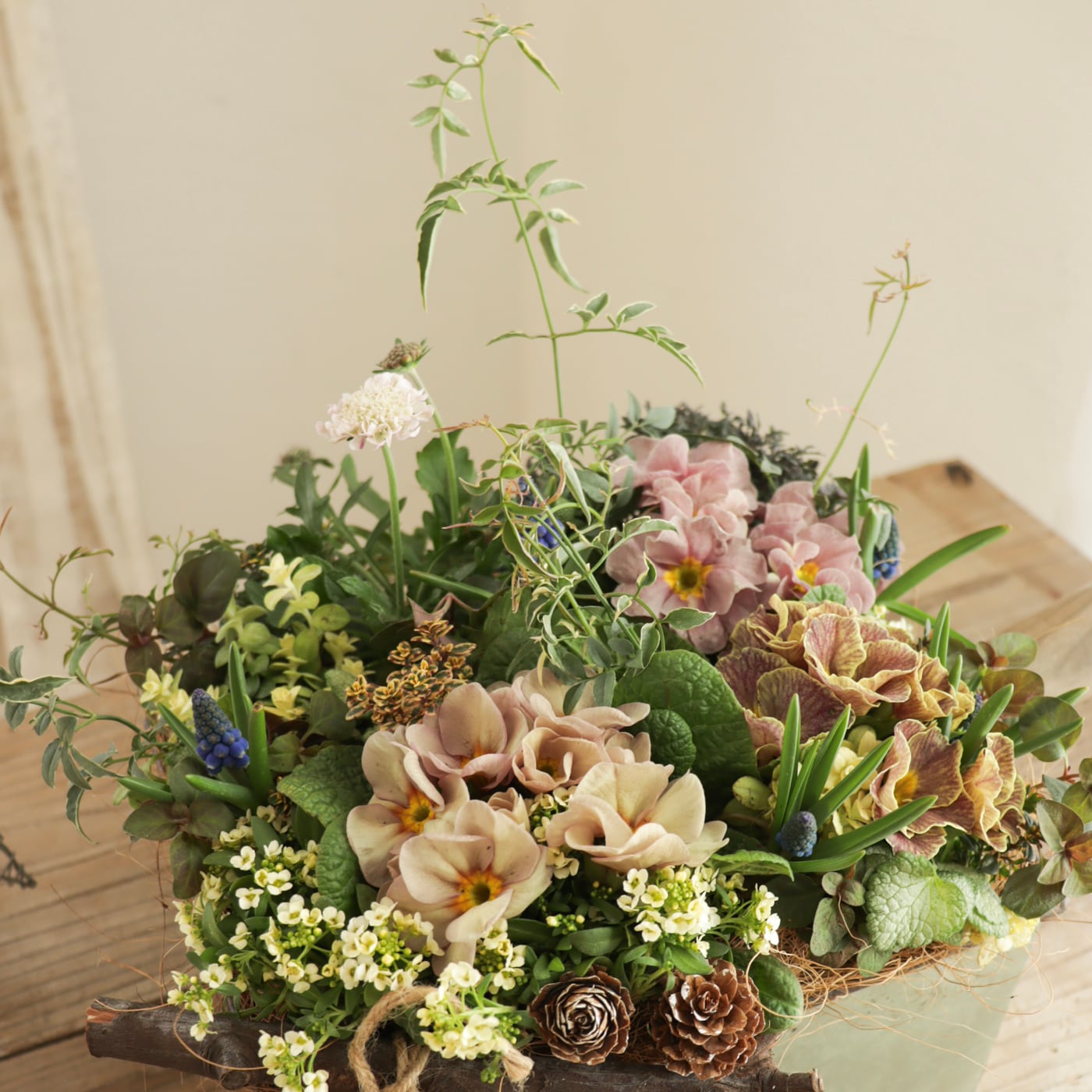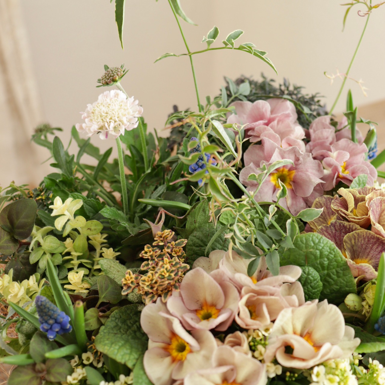 ニュアンスカラーの中に、ムスカリのブルーが映える、