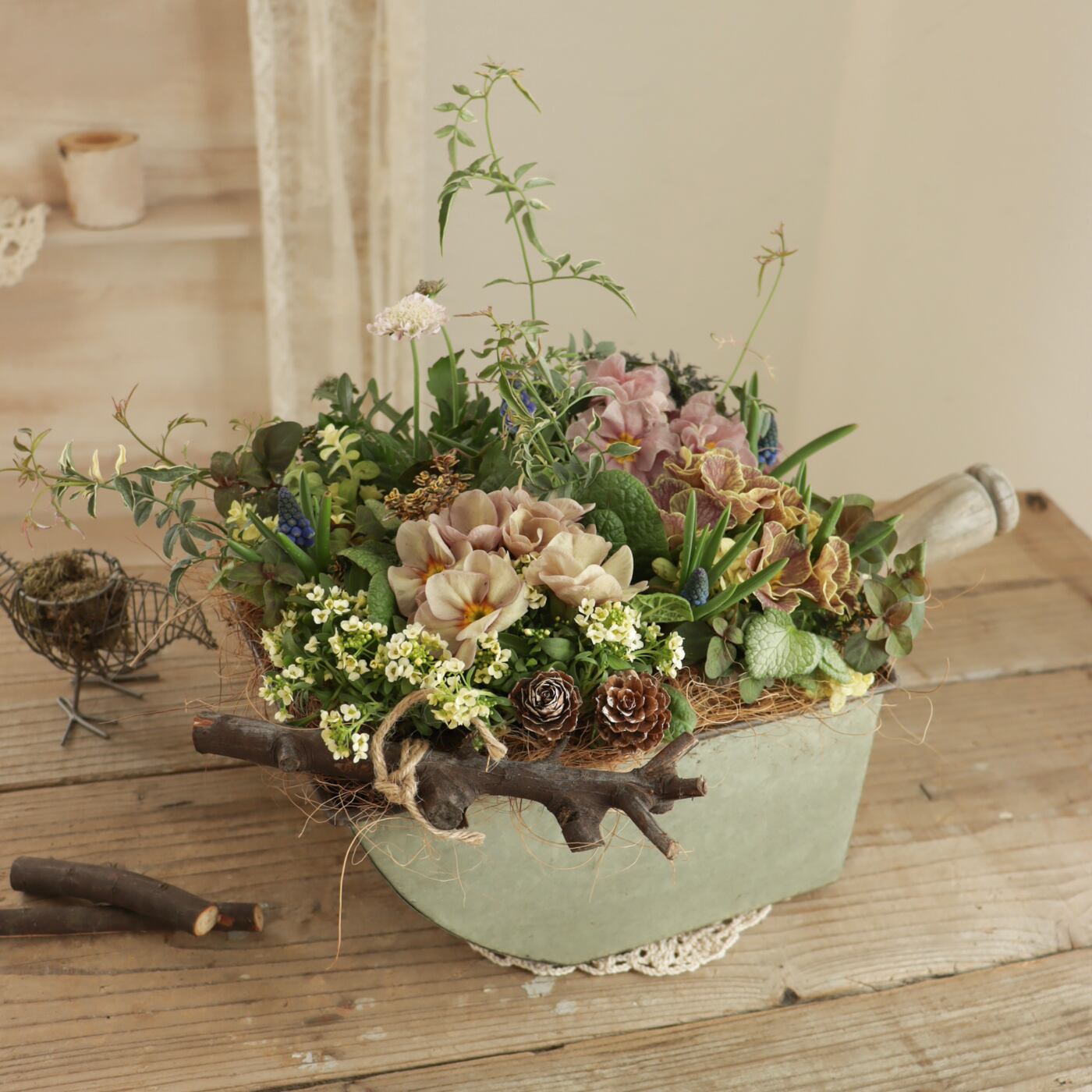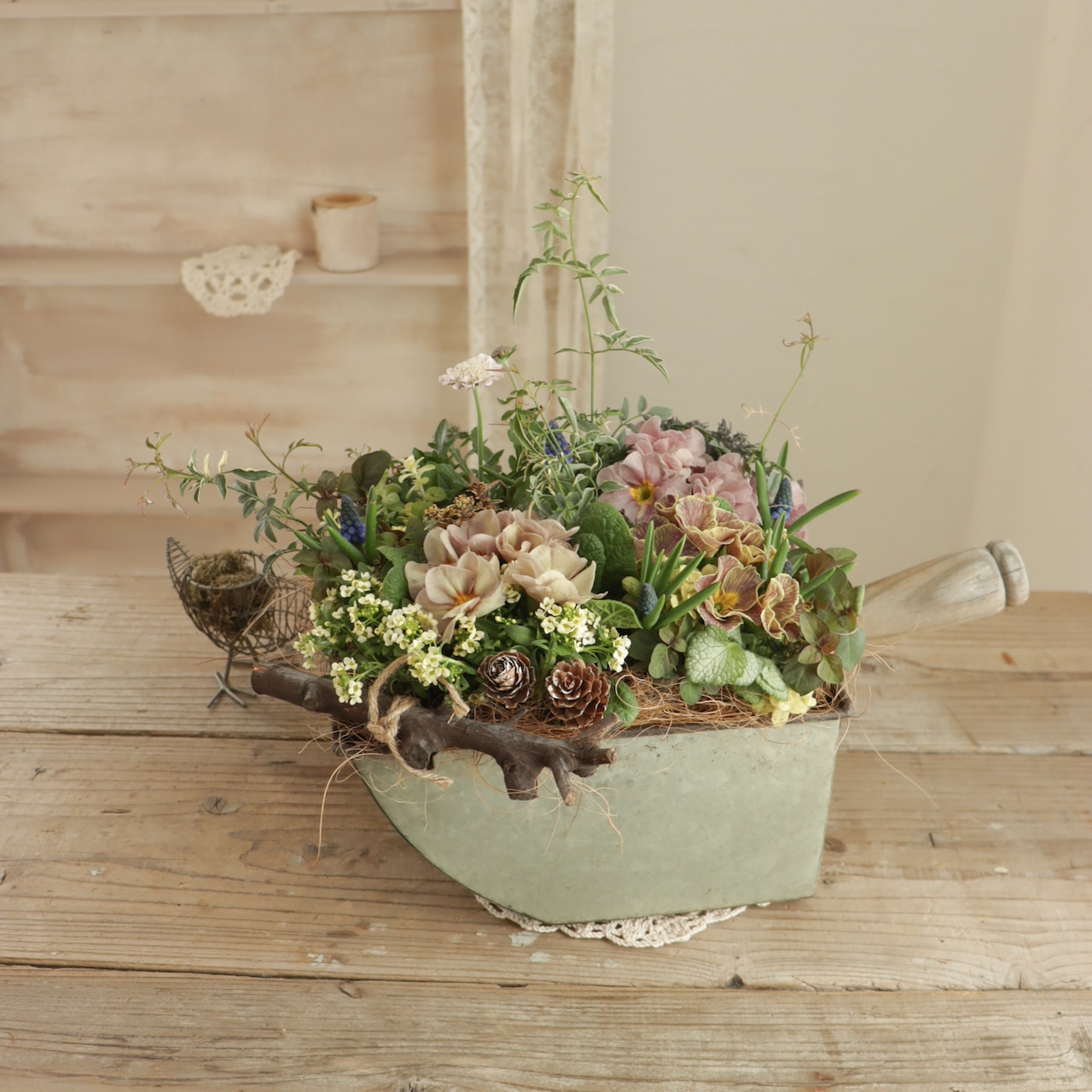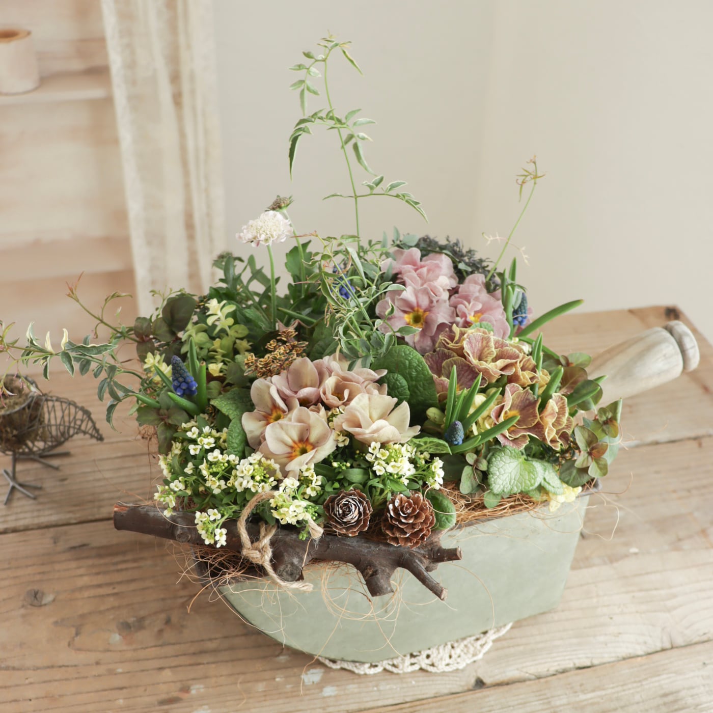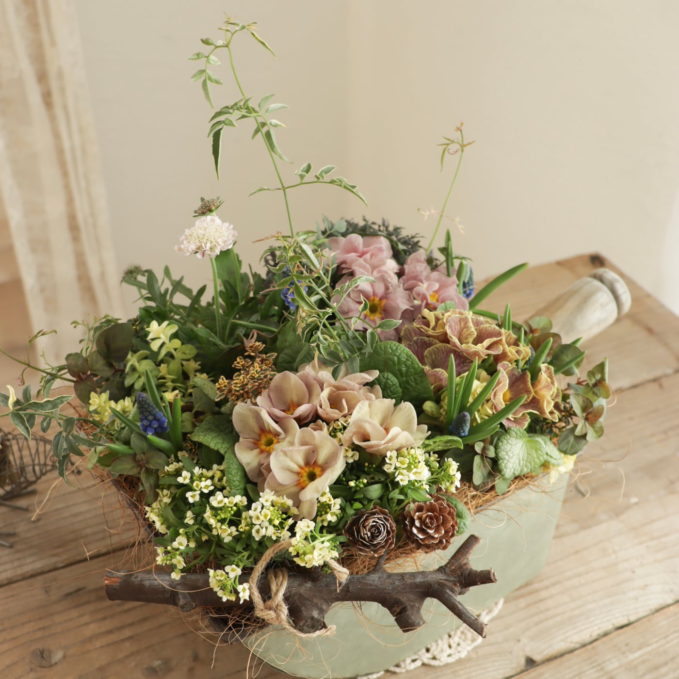 ニュアンスカラーの中に、ムスカリのブルーが映える、