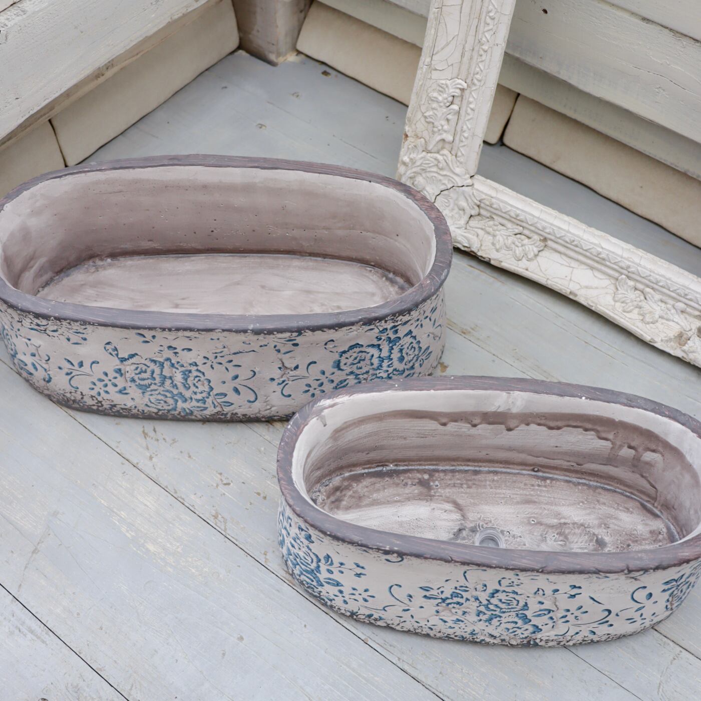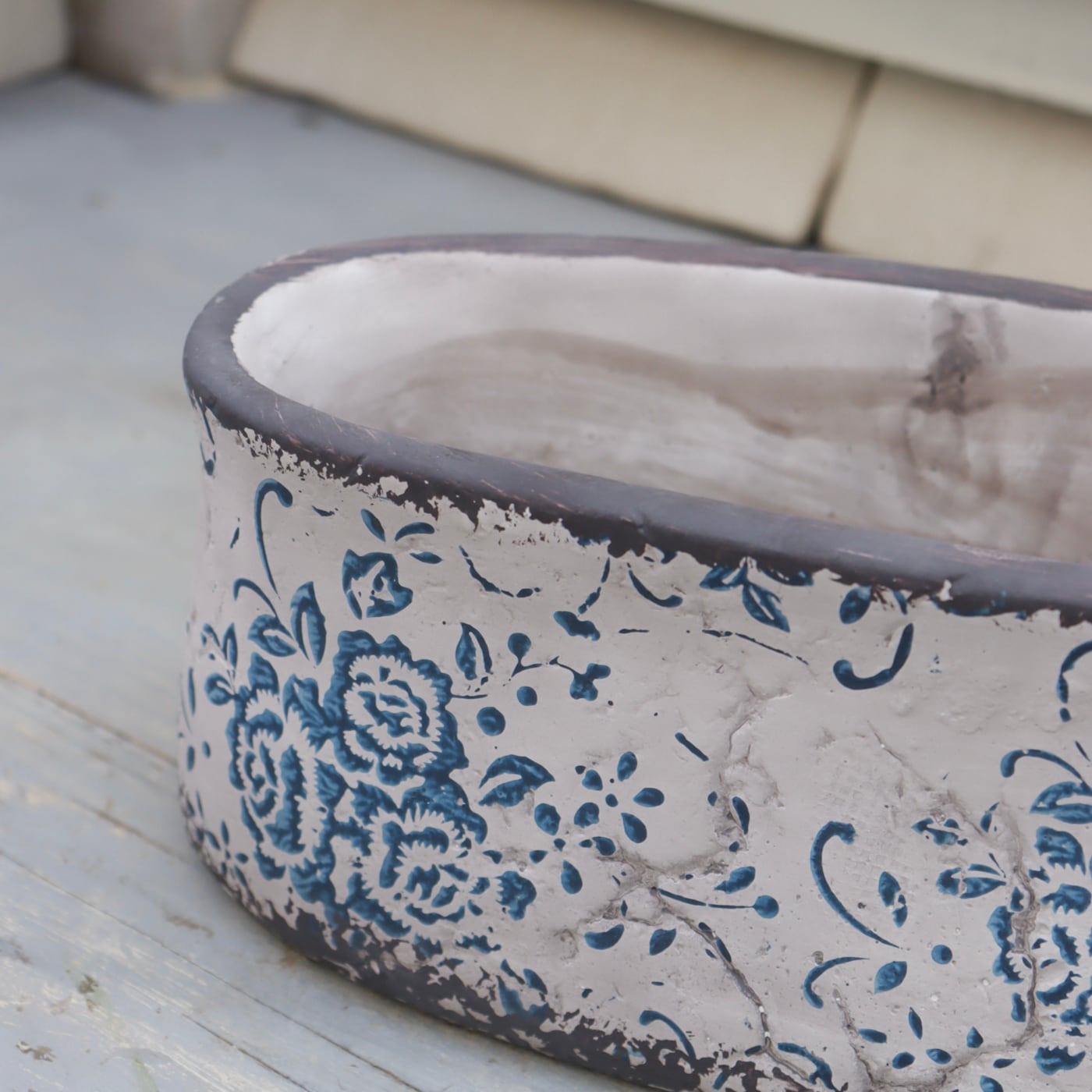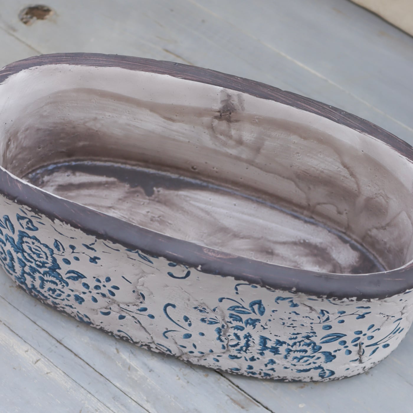 アンプリメフルールオーバルL|アンティーク調ブルー模様の横長セメントポット 大きめサイズ