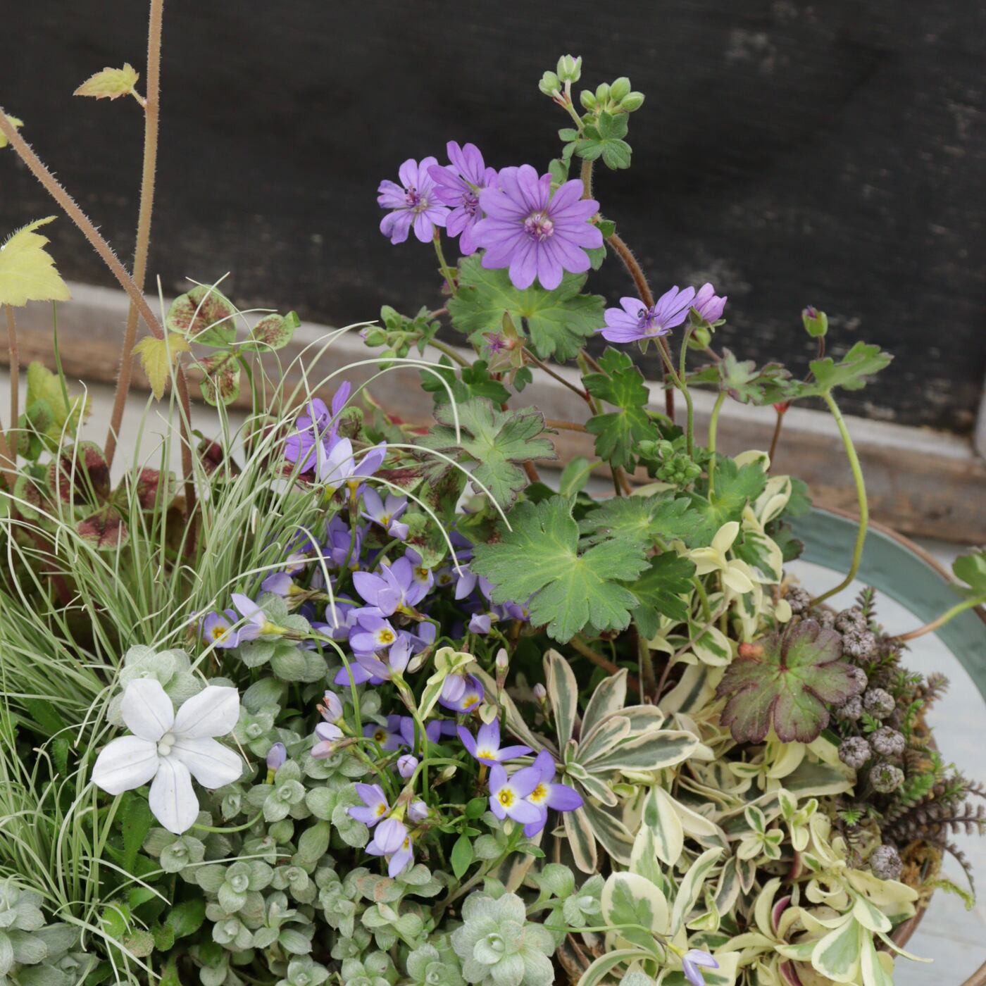 そよ風を束ねた 小さなお庭 すみれ色とくすみピンクの寄せ植えギャザリング