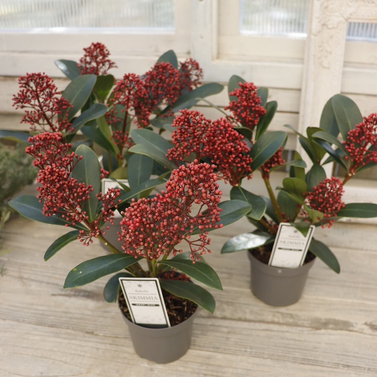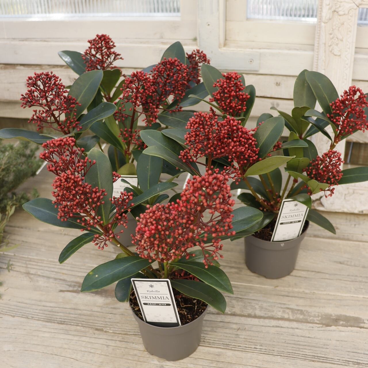 スキミア『ルベラ』お洒落な赤色の蕾が目を引く|育てやすい常緑低木